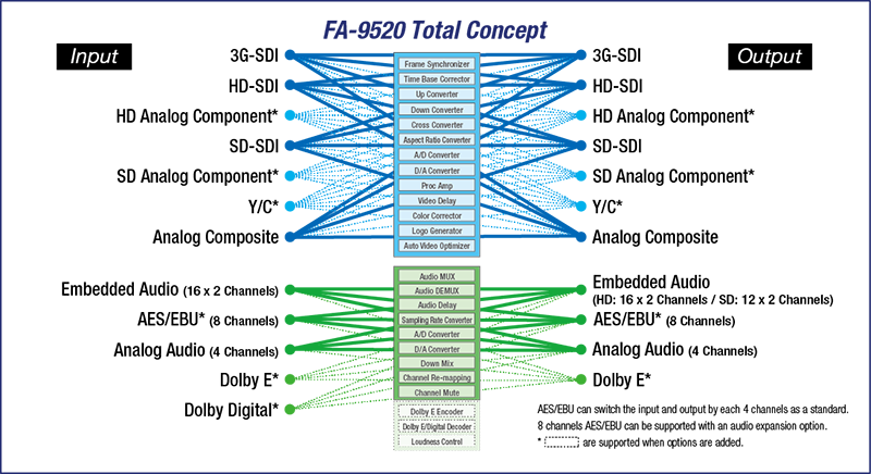 FA-9520是FA-9500的雙通道版本。它支援3G-SDI, HD/SD-SDI,,和模擬複合輸入/輸出,除了幀同步功能,它還標配上/下/交叉變換器、彩色校正器和自動視頻優化(AVO)功能。