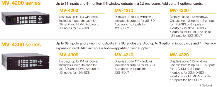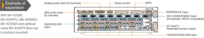 多種選配卡可根據您的需要結合使用*,MV-4200SDI (3G/HD/SD-SDI, 模擬複合 x 20), MV-4200PCI (DVI-I/HDMI/RGBHV x 8), MV-4220SDI (12G x 5 或 3G/HD/SD-SDI x 20),另可選擇MV-4200IF介面卡(GPIO, 串口, 模擬音訊, AES 音訊, 同步)。